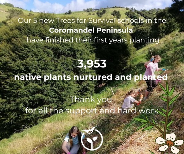 Five Coromandel Peninsula schools were welcomed to the Trees for Survival programme in 2022. With lots of support from landowners, teachers and corporate partners, these 5 schools have completed their first season of potting up, growing and most recently planting their year old native plants on sites ranging from riverside to steep hillside! All of these plants will contribute to revegetation of native forest on the peninsula. Awesome work!